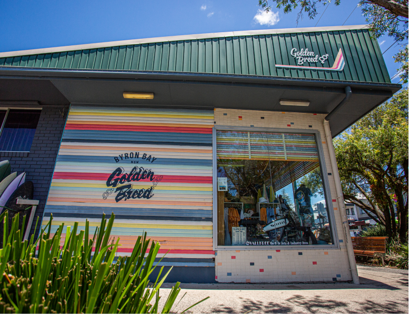 If you’re in Byron Bay, finding Golden Breed's surf shop at 10 Lawson Street is pretty easy. From the town centre, head towards Jonson Street, passing the Visitor Information Centre and the Beach Hotel. Turn onto Lawson Street, and you’ll spot Golden Breed on your left, just a short stroll from Main Beach. We've got an iconic wall with our retro branding that tends to be Instafamous. You can't miss us.