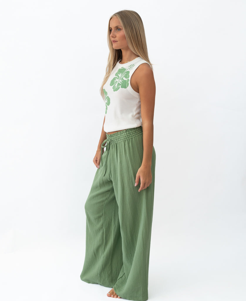 Lightweight Cotton fabric which is perfect during Summer heat. Gia Pant has an elastic waist and self tie. Super comfy and so so cool worn with your favourite bikini top and slides to the beach!