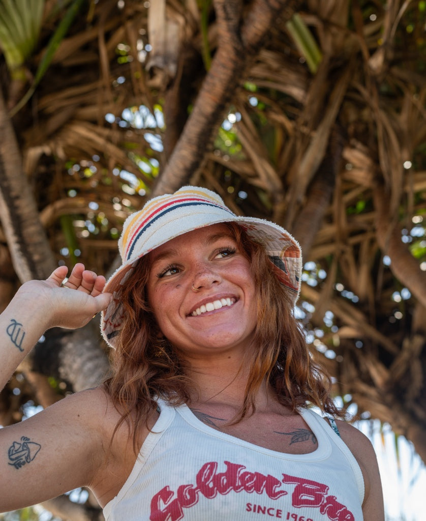 Our Golden Breed Terry Towelling bucket hat now combined with our ever popular Long Island Stripes. Equal parts cool and comfy! An all-year-round must have!