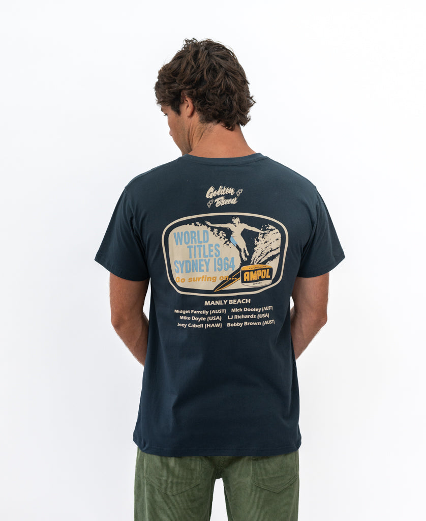Golden Breed loves nothing more than a bit of surf history! A Men's celebratory Tee Shirt featuring the original Ampol World Surf Championships, held at Manly Beach in 1964. 60,000 spectators flocked to the beach to watch the finals.