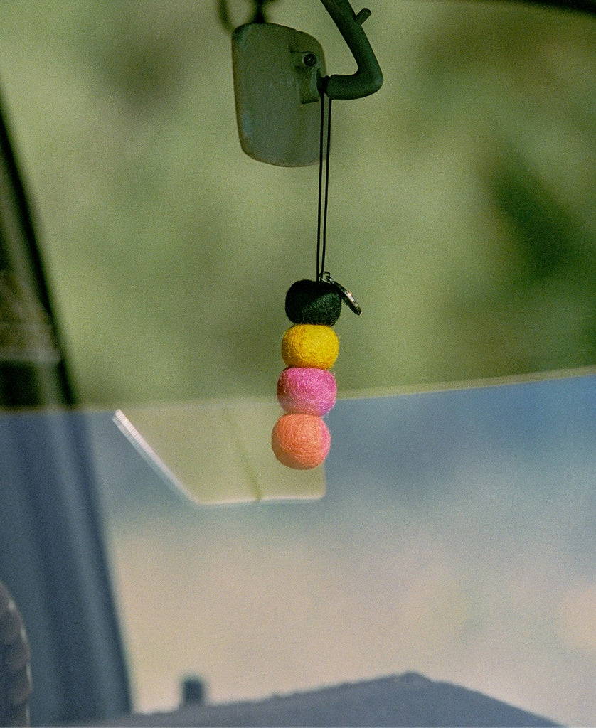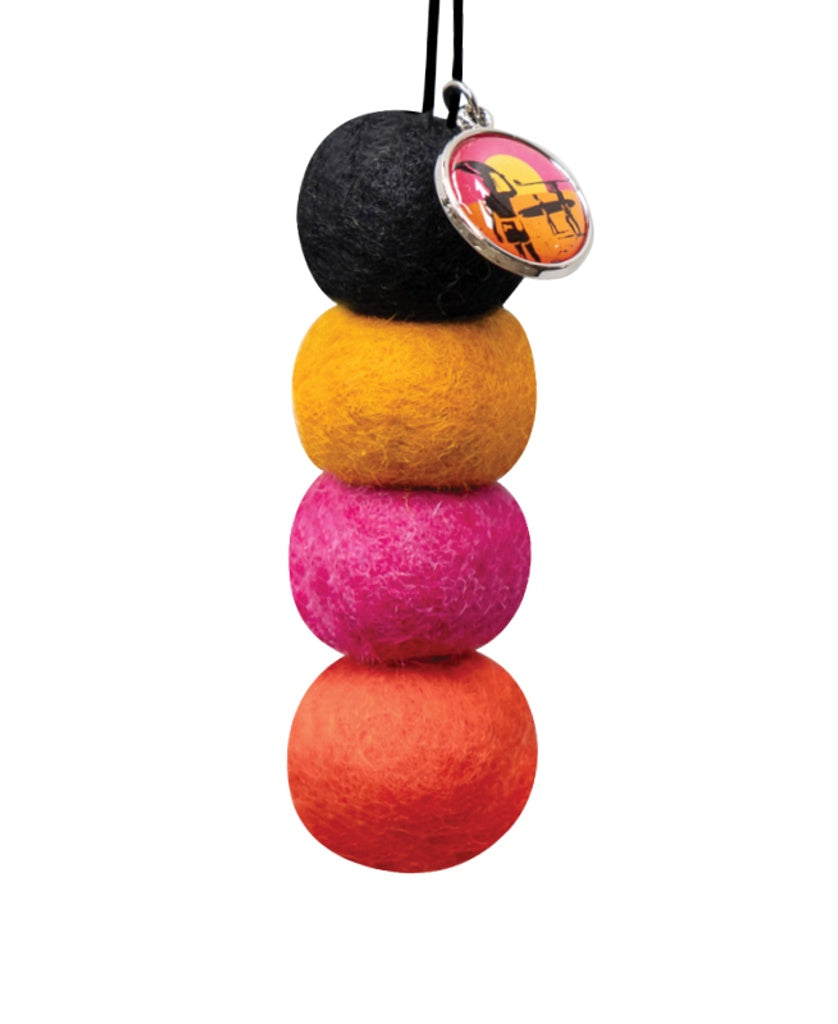4 Unscented Ethically Sourced Wool Felt Balls with branded charm and elastic string for easy hanging.