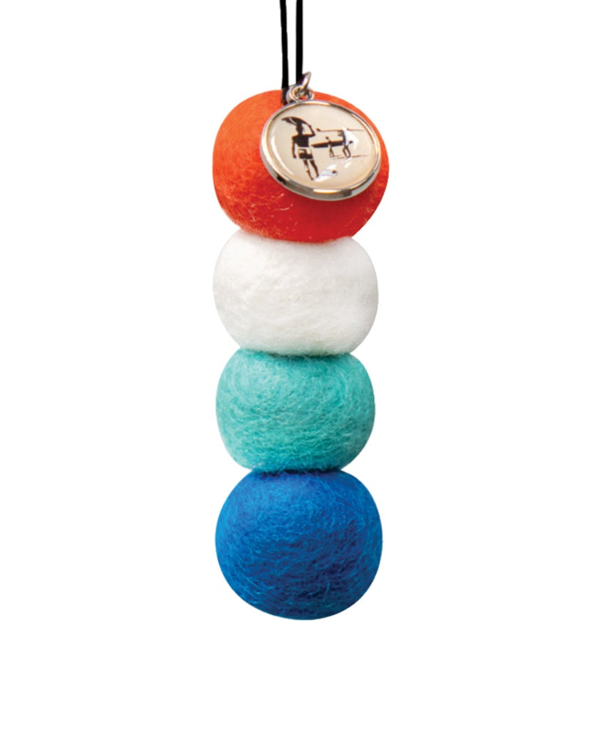 4 Unscented Ethically Sourced Wool Felt Balls with branded charm and elastic string for easy hanging.