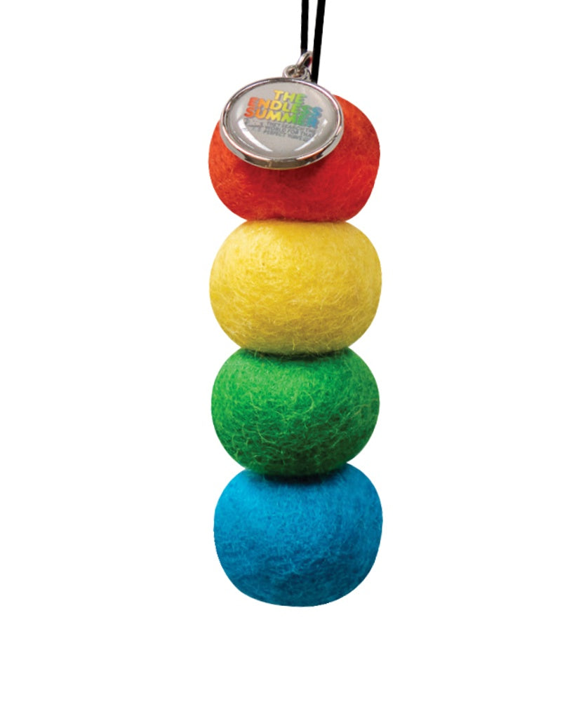 4 Unscented Ethically Sourced Wool Felt Balls with branded charm and elastic string for easy hanging.